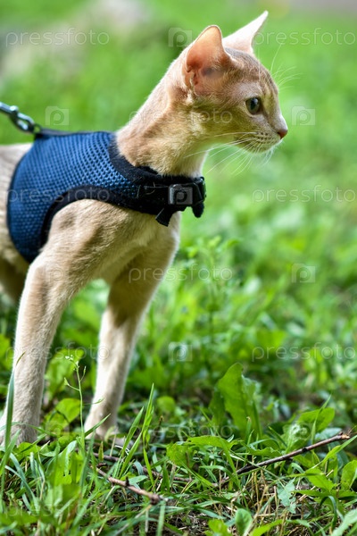 Молодой абиссинский кот окраса Фавн с поводком гуляет по двору. Прогулки с домашними животными, приключения в парке