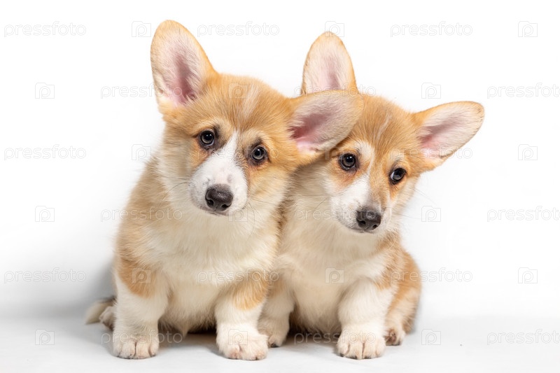 Два очаровательных щенка Пемброк Вельш Корги сидят и смотрят в камеру. на белом фоне