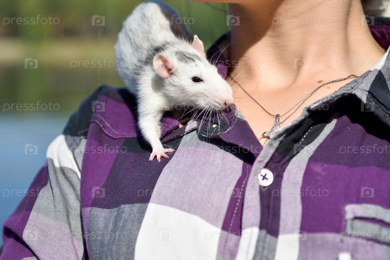 Домашняя крыса Дамбо сидит на плече хозяйки на прогулке в парке в солнечный летний день. Портрет белой домашней крысы на руках мужчины
