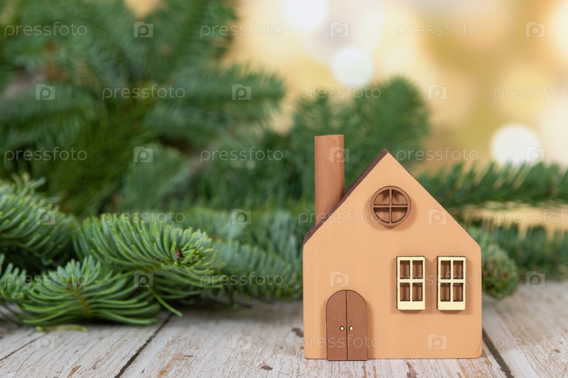 Модель экологически чистого деревянного дома на рождественском фоне