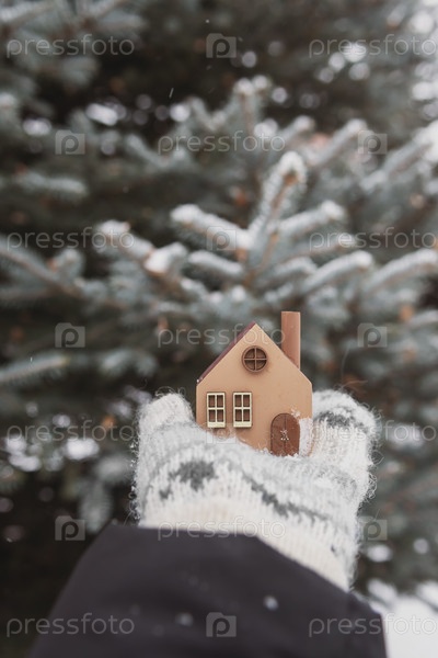 Модель экологически чистого деревянного дома в руках в варежках на зимнем фоне