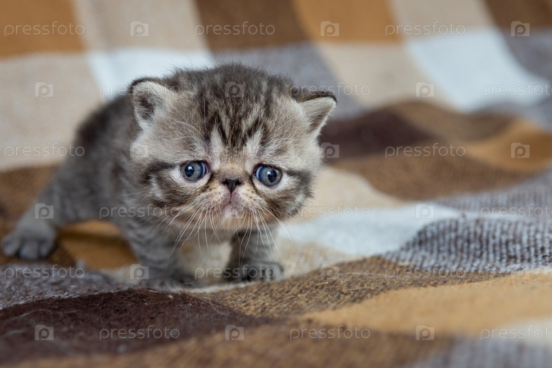 Красивый котенок экзотической короткошерстной породы лежит на коричневом клетчатом фоне . Полосатый коричневый цвет, размытый фокус