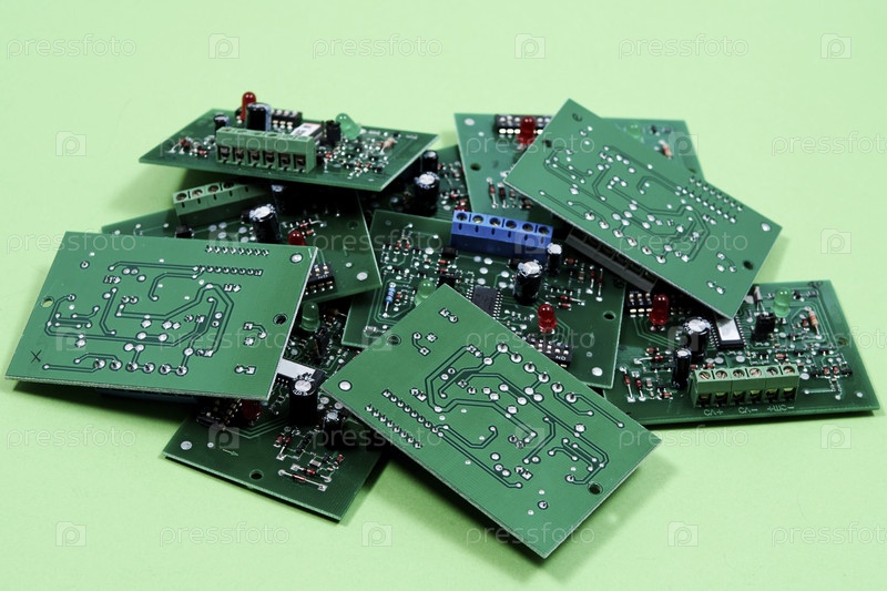 Электронные печатные платы на зеленом фоне. Переработка электронных отходов