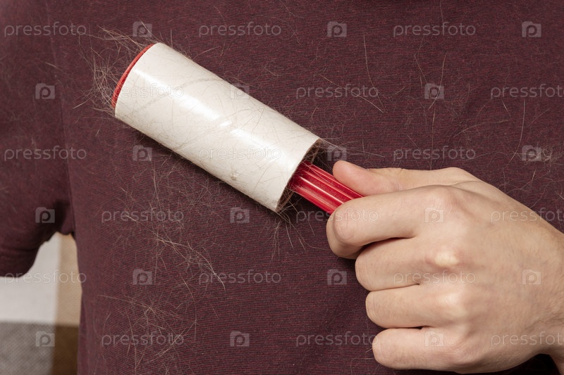 Мужчина с липким роликом для одежды удаляет шерсть животных