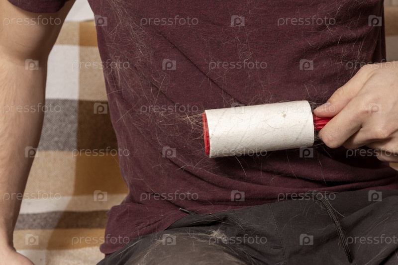 Мужчина с липким роликом для одежды удаляет шерсть животных с одежды. Кошачья шерсть на одежде. Липкий валик для удаления кошачьей шерсти