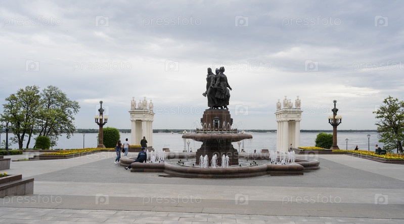 Памятник-фонтан с танцующими женщинами на набережной реки Волги в Волгограде в России. Пасмурный день 26 мая 2021 года