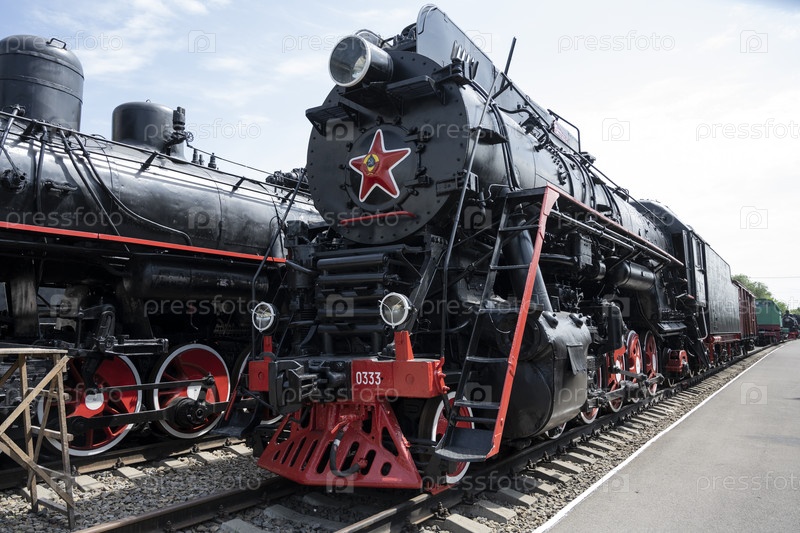 Старый паровоз в музее Ростова-на-Дону в России. Ясный солнечный день 25 мая 2021 года