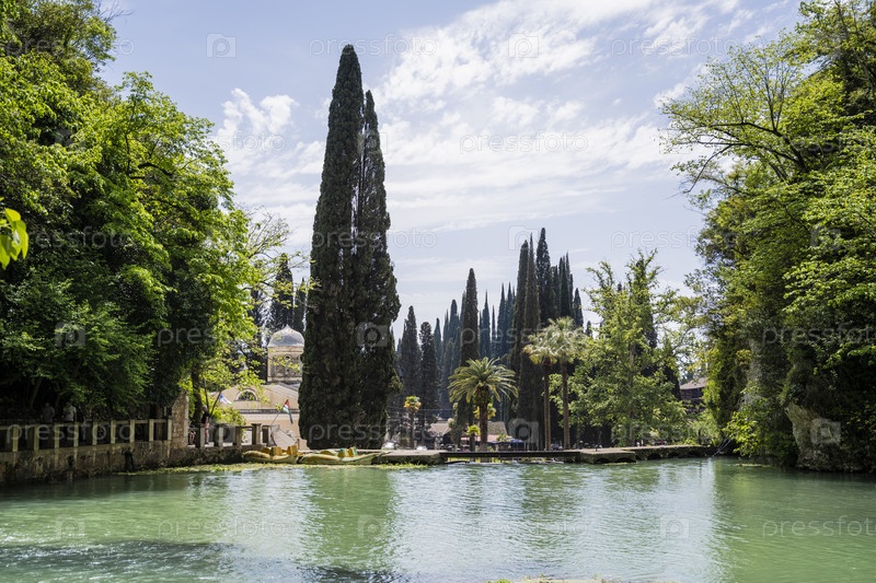 Озеро в Новом Афоне в Республике Абхазия. Ясный солнечный день 16 мая 2021 года