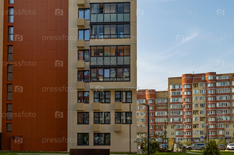 Многоквартирный дом с красочными фасадами. Современная минималистичная архитектура с множеством квадратных стеклянных окон и цветов на здании. Москва, Россия