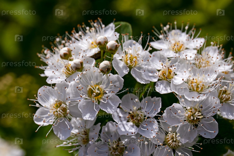 Белые цветы Spiraea vanhouttei в солнечный день с каплями росы. белая смазка