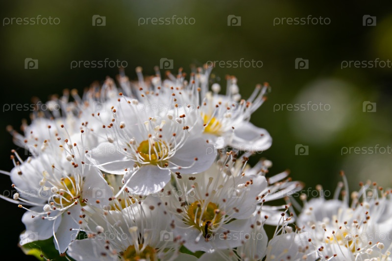 Белые цветы Spiraea vanhouttei в солнечный день с каплями росы, белым жиром