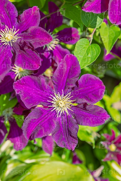 Клематис Ville de Leon с розовыми цветами, красивое садовое растение с крупными пышными цветами, цветущие летом. большой план