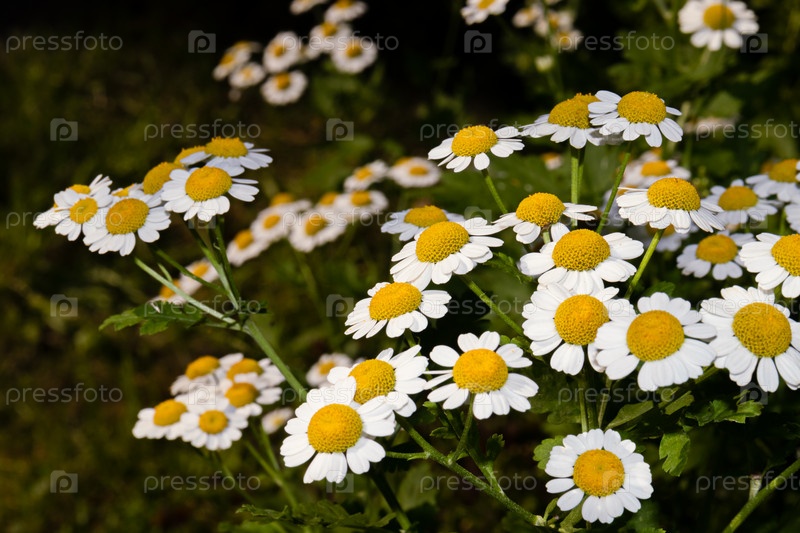 Белые и желтые цветки пиретрумовой лихорадки или щитковидного танацета. В природе одна из разновидностей ромашки далматинская