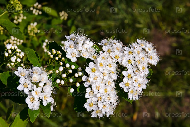 Цветет спирея кустовая. Спирея — род лиственных декоративных кустарников семейства розоцветных, соцветия крупным планом