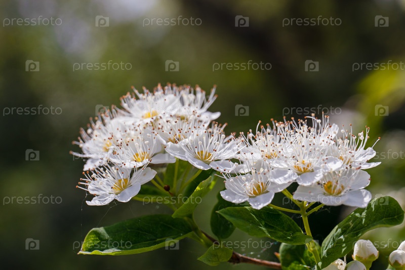 Белые цветы Spiraea vanhouttei в солнечный день с каплями росы, белым жиром