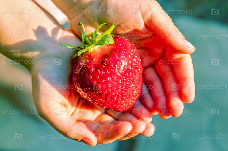 Спелая крупная клубника на детской ладони. Красная летняя ягода, урожай