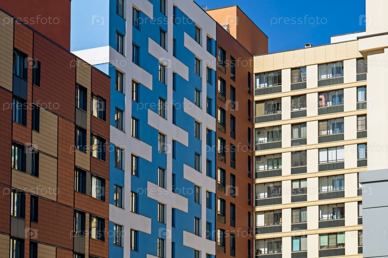 Многоквартирный дом с красочными фасадами. Современная минималистичная архитектура с множеством квадратных стеклянных окон и цветов на здании. Москва, Россия