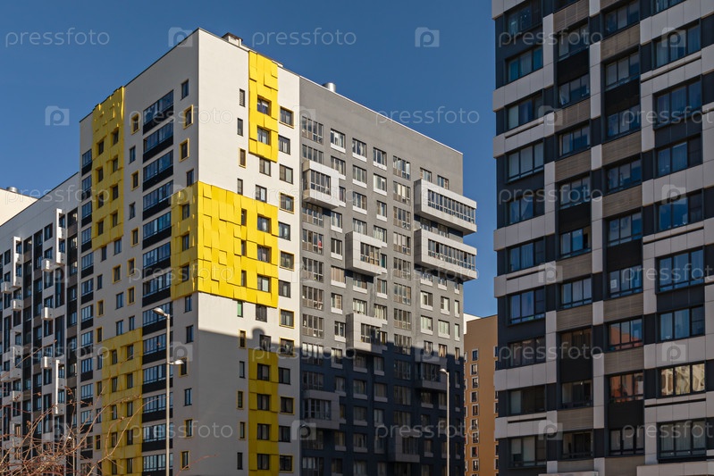 Многоквартирный дом с красочными фасадами. Современная минималистичная архитектура с множеством квадратных стеклянных окон и цветов на здании. Москва, Россия