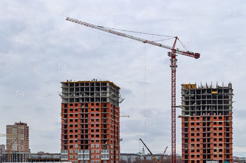 Строительство современного жилого многоэтажного дома с краном. Строительный кран и здание на фоне неба