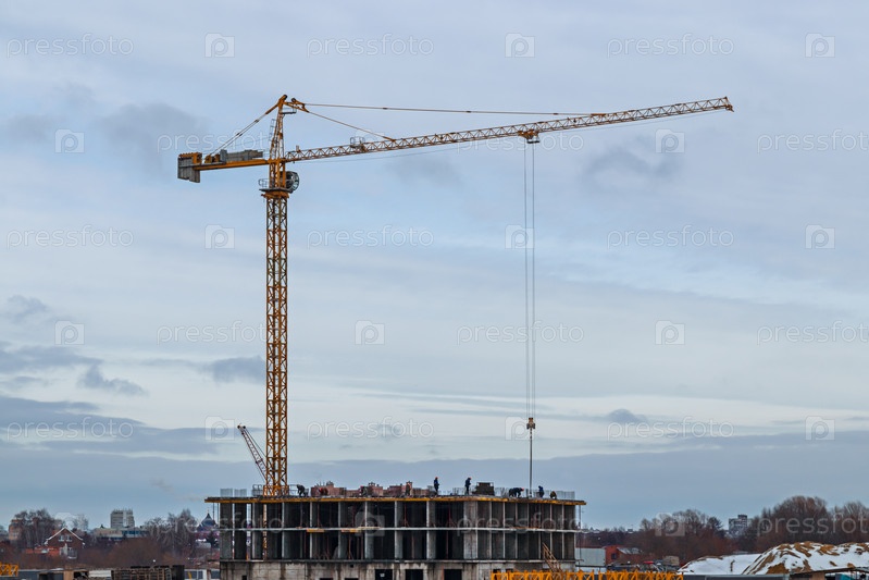 Строительство современного жилого многоэтажного дома с краном. Строительный кран и здание на фоне неба