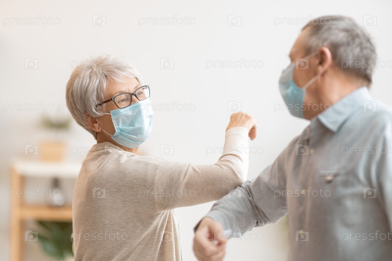 Пожилая пара здоровается, стуча локтями