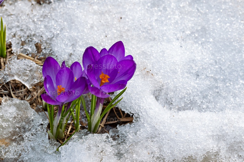Первые полевые цветы крокусов весной на снежном фоне. природа фон