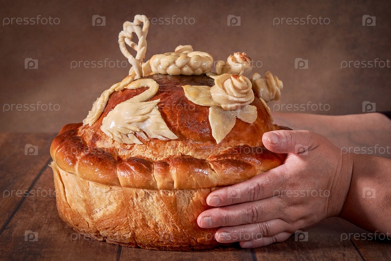Русский свадебный каравай на деревянном столе держит в руках пожилая пухленькая женщина. Русская свадебная церемония. Буханка свадебного торта крупным планом