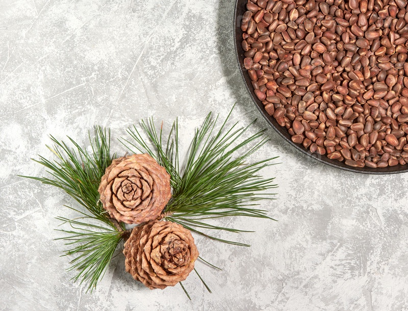 Кедровые или кедровые орехи в миске с шишками на сером фоне и ветка кедрового дерева с зелеными иголками