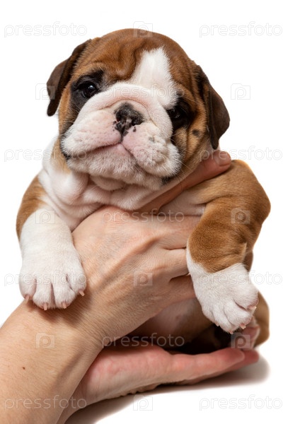 Милый щенок английского бульдога сидит на руках и смотрит прямо в камеру