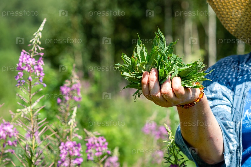 Пожилая женщина собирает листья иван-чая для ферментации. Сбор лекарственных трав