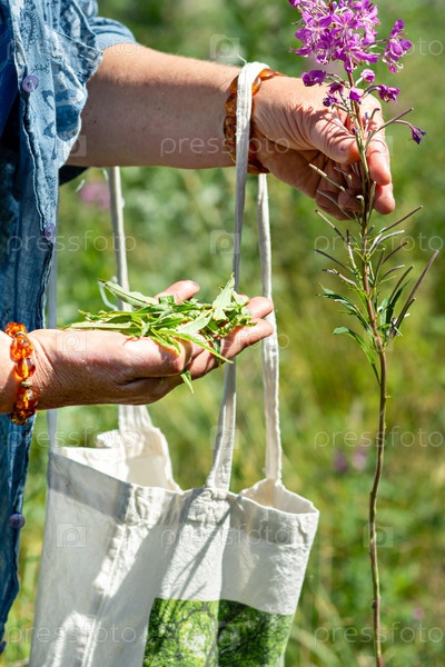 Пожилая женщина собирает листья иван-чая для ферментации. Сбор лекарственных трав