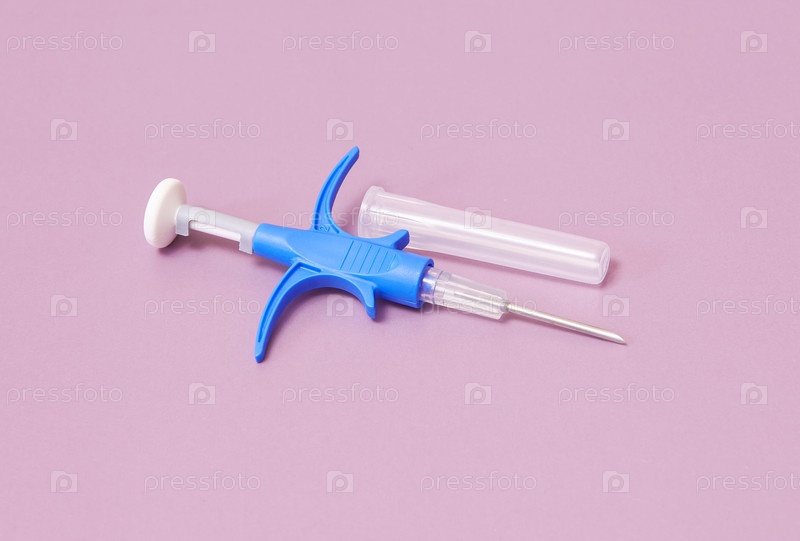 Шприц с микрочипом для идентификации животных на розовом фоне крупным планом