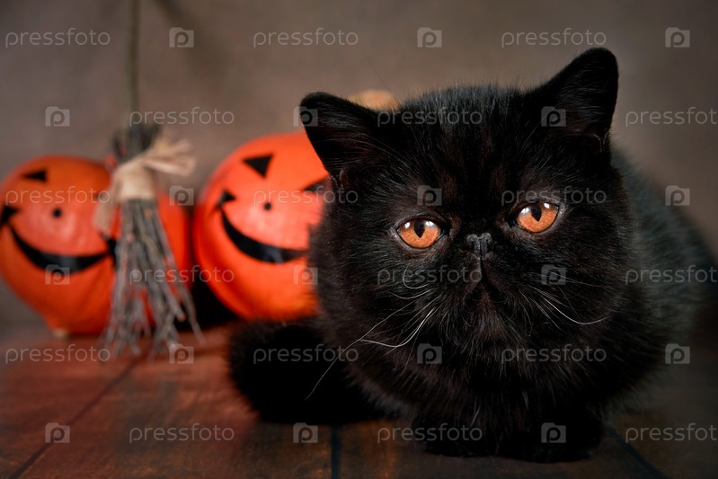 Экзотическая порода черной кошки с тыквой Хэллоуина на коричневом фоне