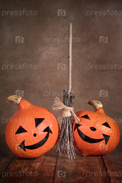 Две тыквы Хэллоуина и метла ведьмы на темном фоне