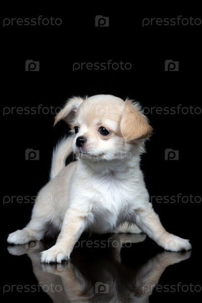 Забавный портрет испуганного щенка чихуахуа на изолированном черном фоне