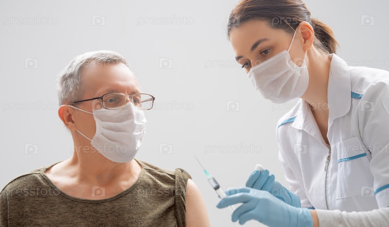 Врач делает прививку пожилому мужчине в маске
