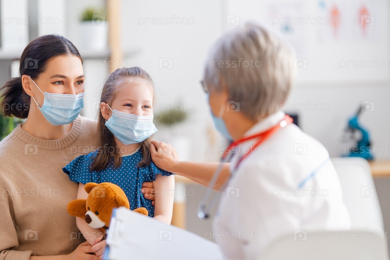 Врач, ребенок и мать в масках