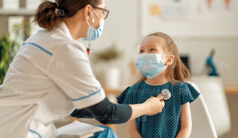 Врач и ребенок в масках.Осмотр педиатра