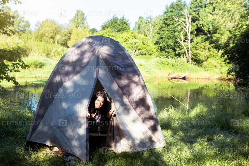 Счастливая женщина в клетчатой рубашке утром выходит из туристической палатки на прогулку по берегу реки. Кемпинг на природе, ночлег в дикой природе, семейный отдых и приключения
