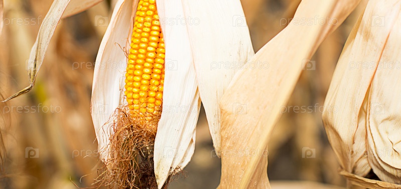 Спелая желтая кукуруза крупным планом на фоне сухого высохшего поля. Зерновые, сельское хозяйство, праздник осеннего урожая, День благодарения