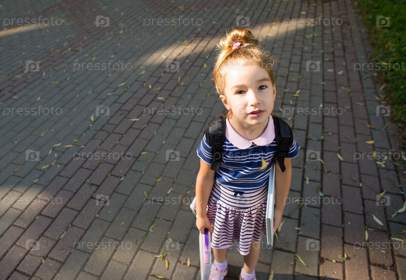 В кадр смотрит маленькая девочка в школьной форме с рюкзаком. Концепция обратно в школу. Начальная школа, развивающие занятия для дошкольников. Место для текста