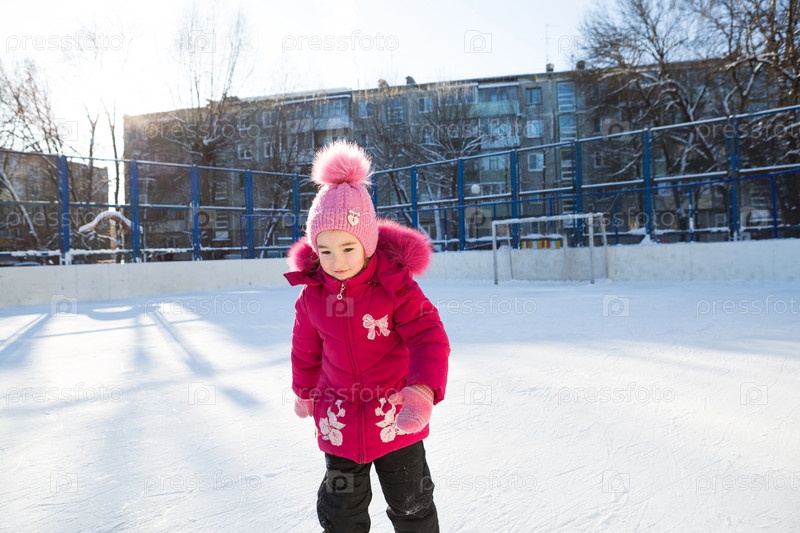 Маленькая девочка 5 лет катается на коньках на катке во дворе дома. Морозный зимний солнечный день, активные зимние виды спорта и образ жизни