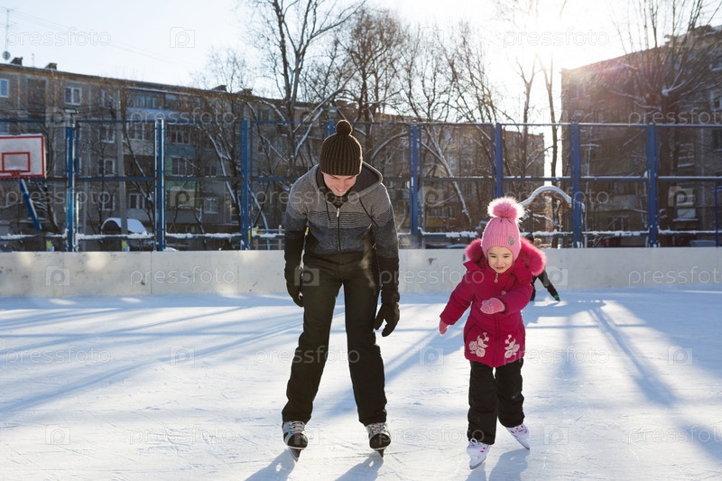 Папа учит свою маленькую дочь кататься на коньках на катке во дворе многоэтажного дома в городе. Морозный зимний солнечный день, активные зимние виды спорта и образ жизни