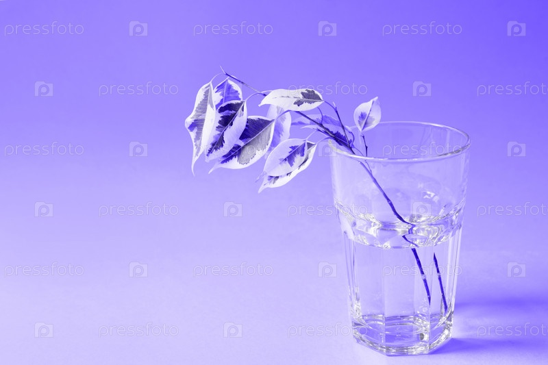 Стебель фикуса Бенджамина пестролистного для укоренения в стакане на фиолетовом фоне . Вегетативное размножение комнатных растений