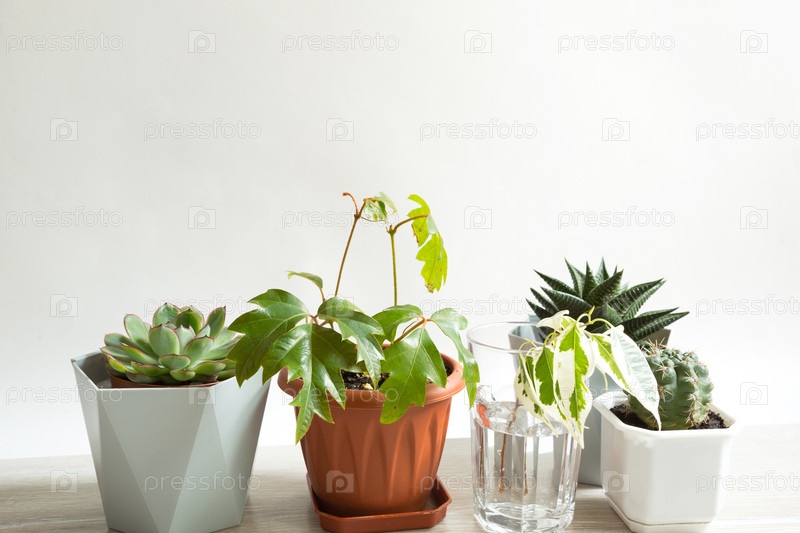 Группа популярных комнатных растений в горшках: хавортия, фикус, роициссус, кактус, эхеверия. Уход за комнатными растениями
