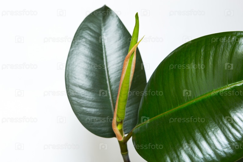 Каучуконосный лист фикуса крупным планом с бутоном, открывающимся новым молодым листом. Уход за домашними растениями, выращивание, полив и удобрение