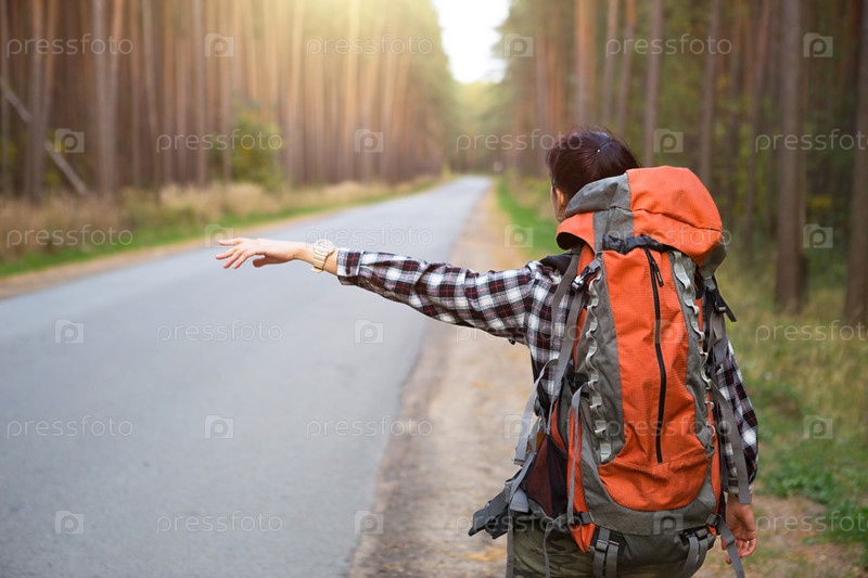 Туристка в клетчатой рубашке с большим оранжевым рюкзаком возле шоссе в лесу голосует за поездку. Автостоп, внутренний туризм. Рюкзакчик, одиночное приключение, путешествие, походы