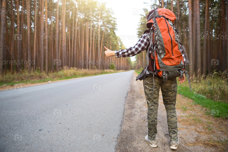 Туристка в клетчатой рубашке с большим оранжевым рюкзаком возле шоссе в лесу голосует за поездку. Автостоп, внутренний туризм. Рюкзакчик, одиночное приключение, путешествие, походы