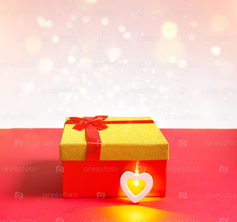 Красная подарочная коробка с бантом и сердцем со светящейся лампой внутри на красном фоне с золотым блеском, copyspace