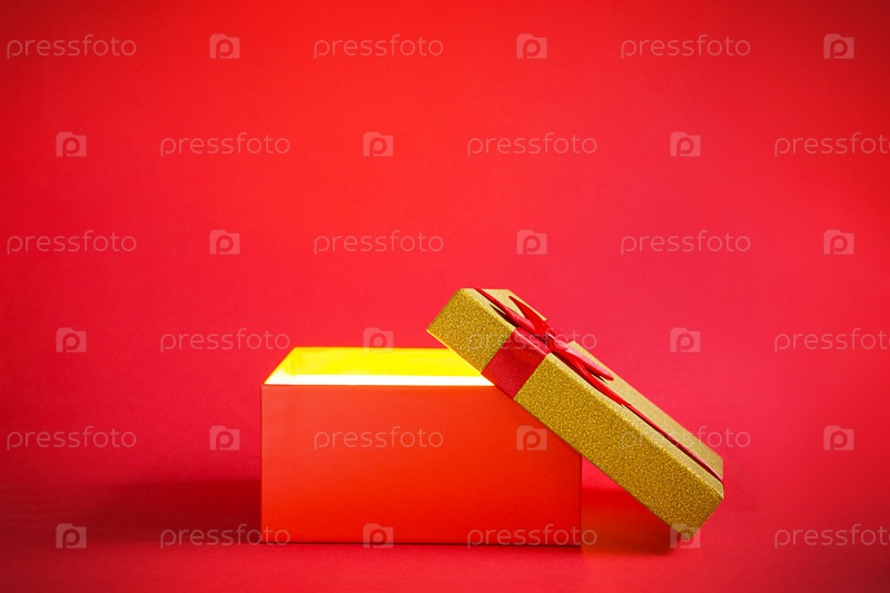 Открытая красная подарочная коробка с бантом с золотым сиянием и блеском внутри на красном фоне, баннер, копирайт. всеобщий праздник, рождество, день святого валентина, новый год, день рождения, юбилей, подарок